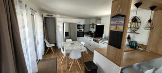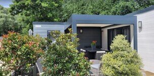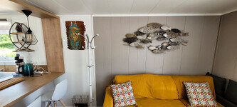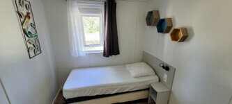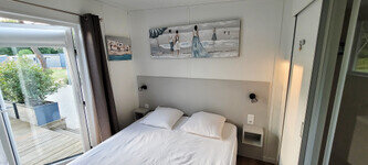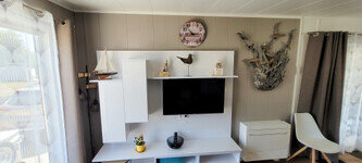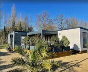 Par son design contemporain avec sa disposition en L et ses baies vitrées, cet écolodge de 60m2 est conçu avec une belle pièce de vie : un salon, un espace repas et une cuisine ouverte très bien équipée (congélateur, frigo américain, lave vaisselle, etc….).